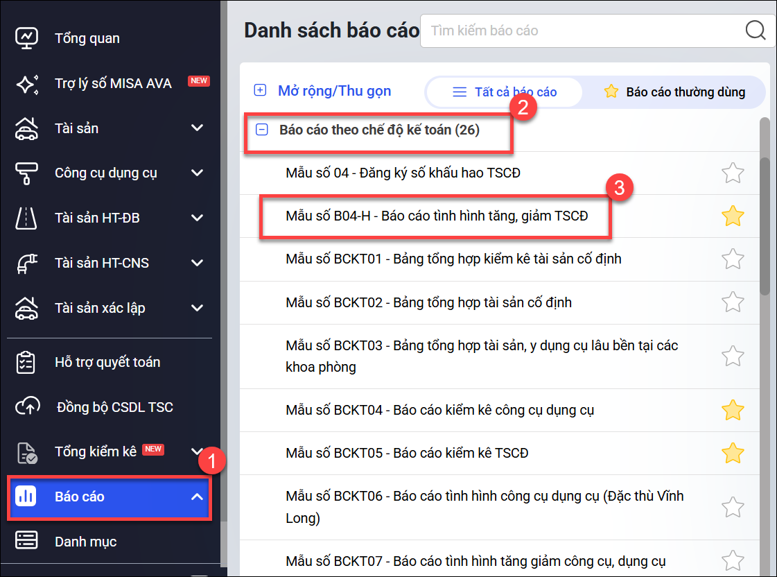 Để in được Mẫu số B04-H – Báo cáo tình hình tăng, giảm TSCĐ, anh/chị thực hiện các bước sau: