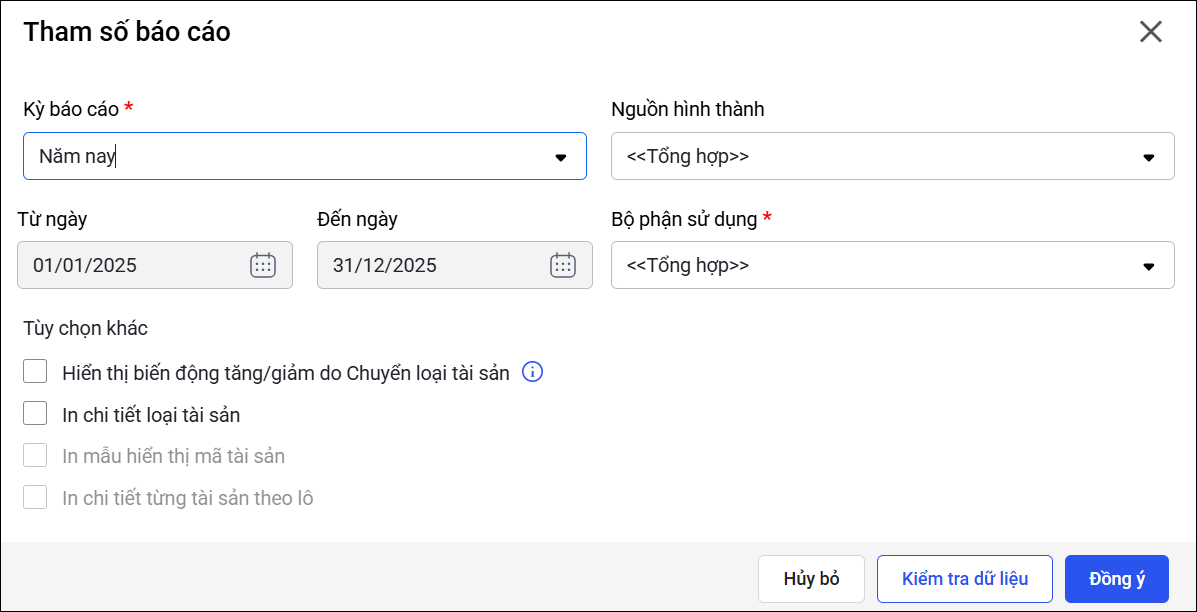 Chọn “Tổng hợp” để hiển thị toàn bộ tài sản, không phân biệt theo bộ phận sử dụng (thường chọn tham số này).