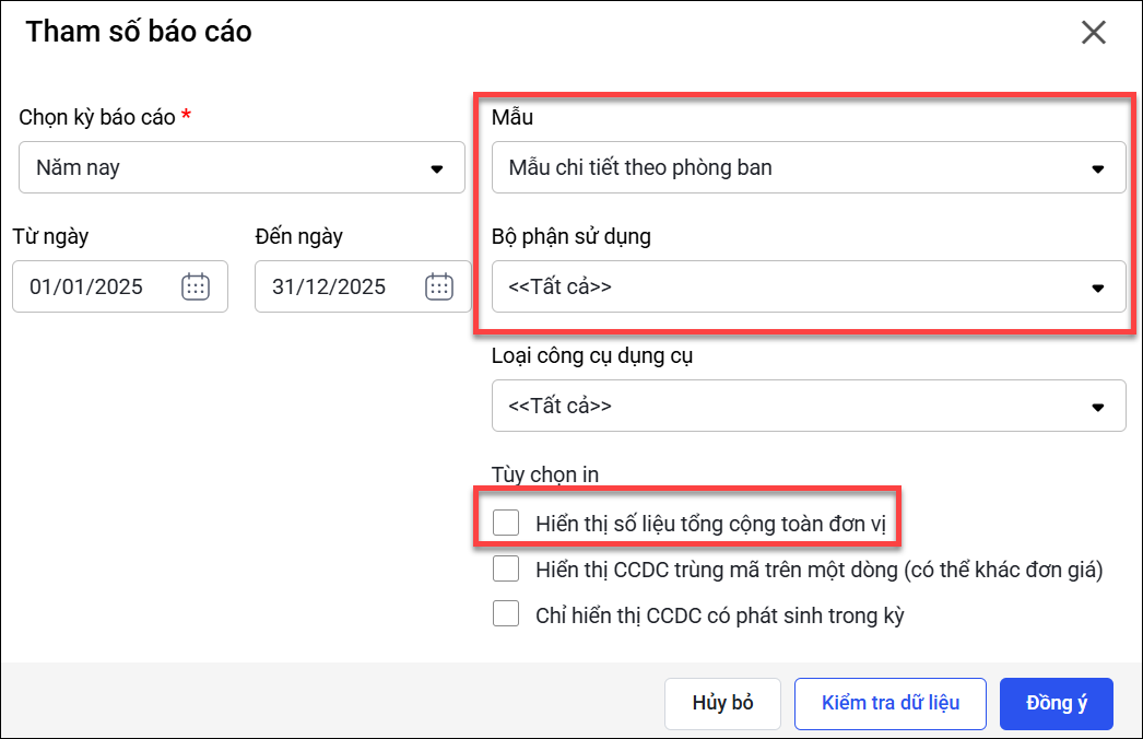 Tích chọn “Hiển thị số liệu tổng cộng toàn đơn vị”: Số liệu CCDC của các phòng ban được hiển thị trên cùng một trang báo cáo, có dòng tổng cộng cho từng phòng ban.