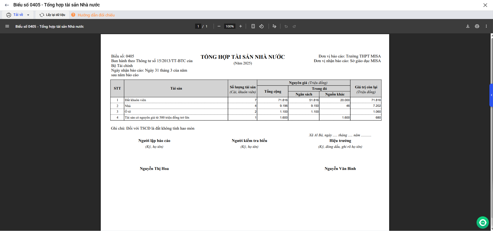 Bài viết giới thiệu tính năng mới giúp anh/chị in được Biểu số 0405 – Tổng hợp tài sản nhà nước.