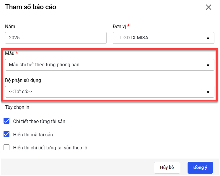 - Chọn Mẫu chi tiết theo từng phòng ban nếu muốn in số liệu hao mòn theo từng phòng ban. Mẫu này sẽ kèm theo tham số Bộ phận sử dụng.