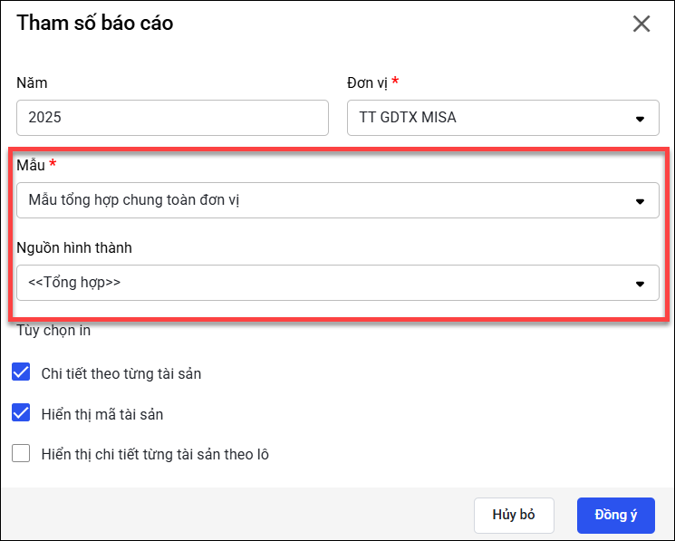 Chọn “Tổng hợp” để hiển thị toàn bộ tài sản, không phân biệt theo nguồn hình thành (thường chọn tham số này).