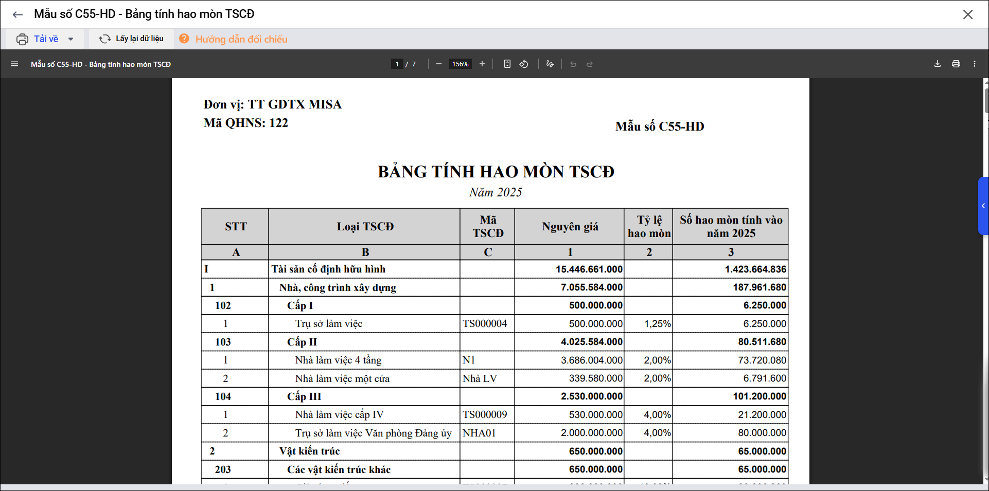 Bài viết này giúp anh/chị in được C55a-HD: Bảng tính hao mòn TSCĐ, mẫu này giúp theo dõi và tính toán hao mòn tài sản cố định trong kỳ báo cáo.