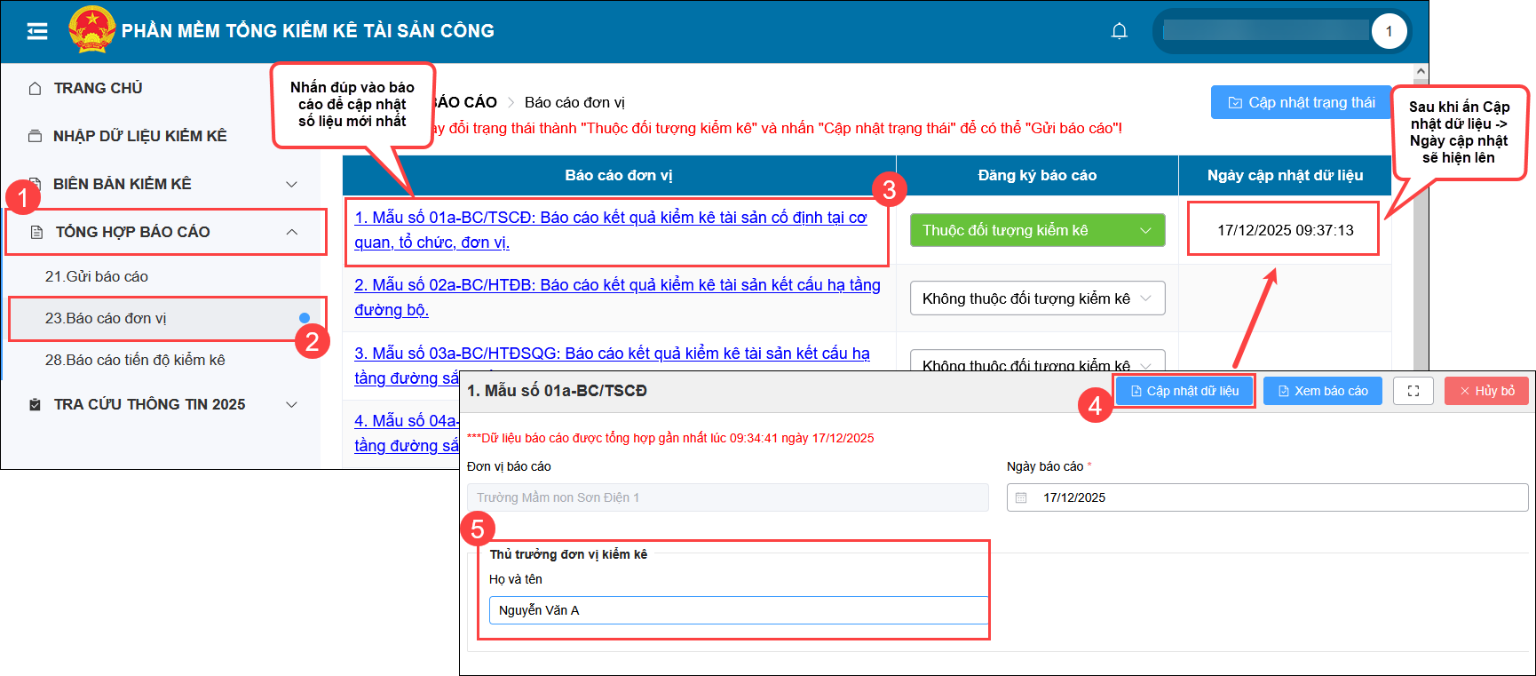 • Điền thông tin Thủ trưởng đơn vị kiểm kêNgày báo cáo, nhấn