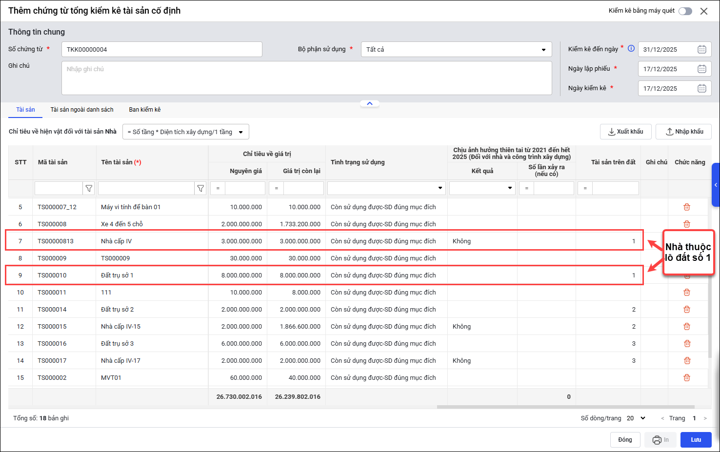 • Nhập thông tin chứng từ tổng kiểm kê tài sản: