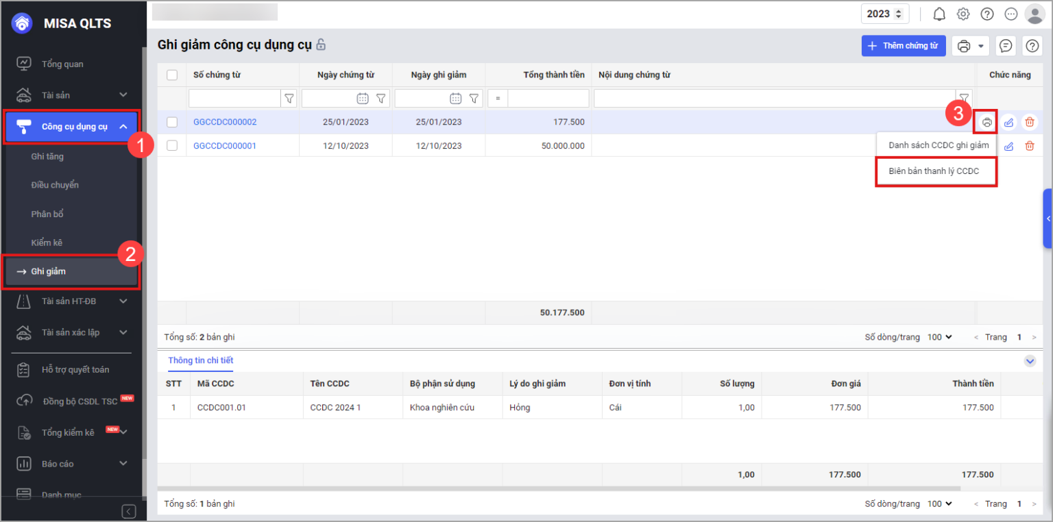 Lưu ý: Chức năng ghi giảm CCDC hiện không hỗ trợ khai báo hoặc lựa chọn ban thanh lý trên phần mềm.