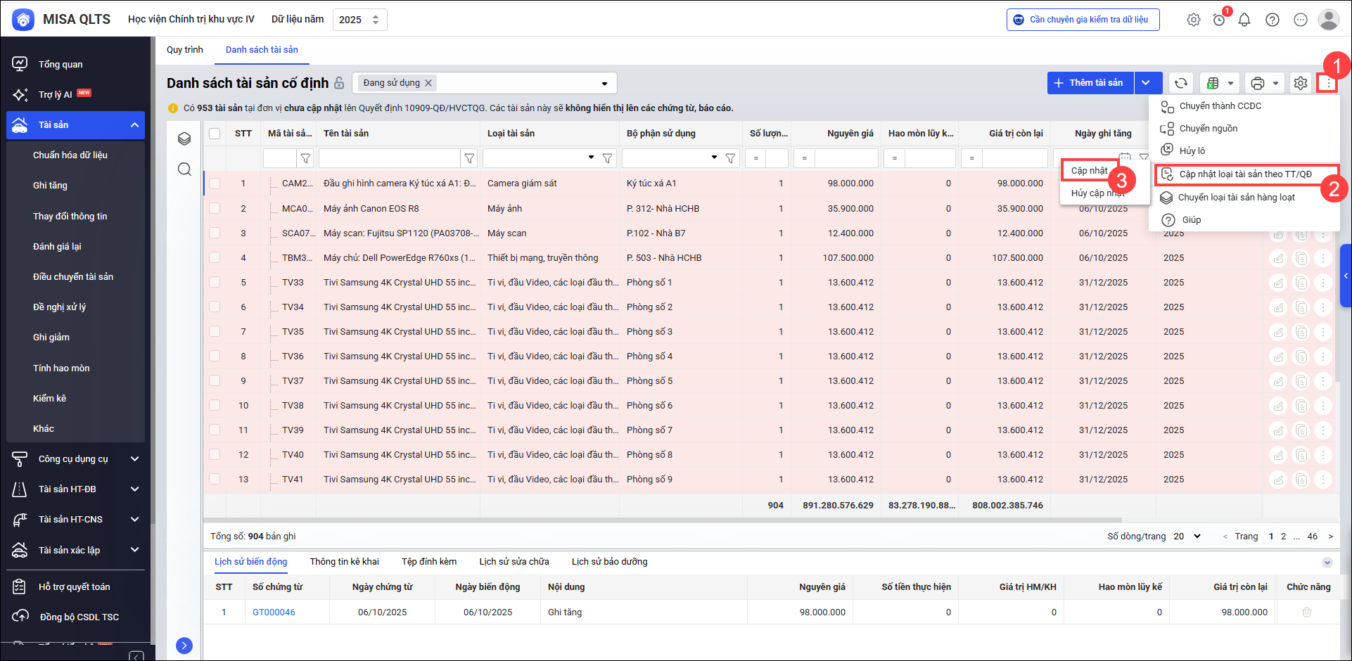 Tại màn hình Danh sách tài sản cố định, nhấn vào biểu tượng dấu ba chấm, chọn Cập nhật loại tài sản theo thông tư, sau đó chọn Cập nhật để cập nhật Quyết định số 10909/QĐ-HVCTQG