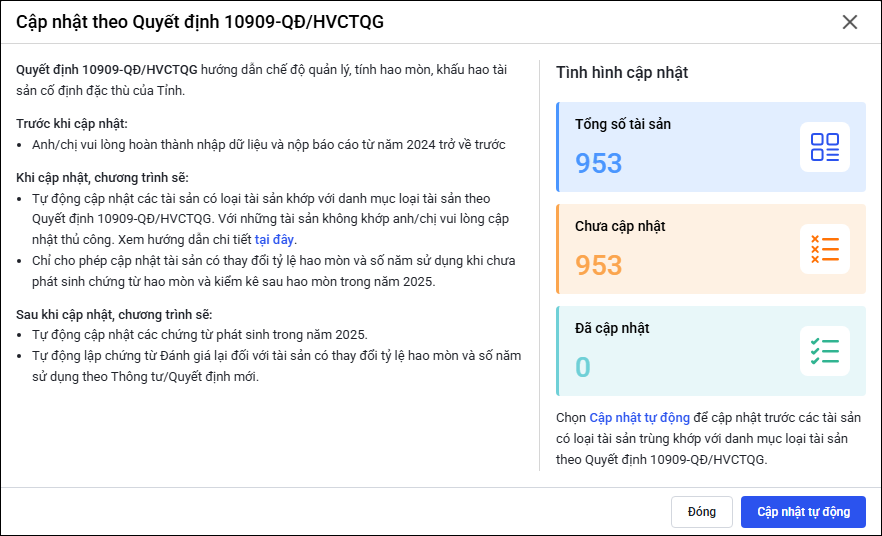 Tại màn hình Danh sách tài sản cố định, nhấn vào biểu tượng dấu ba chấm, chọn Cập nhật loại tài sản theo thông tư, sau đó chọn Cập nhật để cập nhật Quyết định số 10909/QĐ-HVCTQG