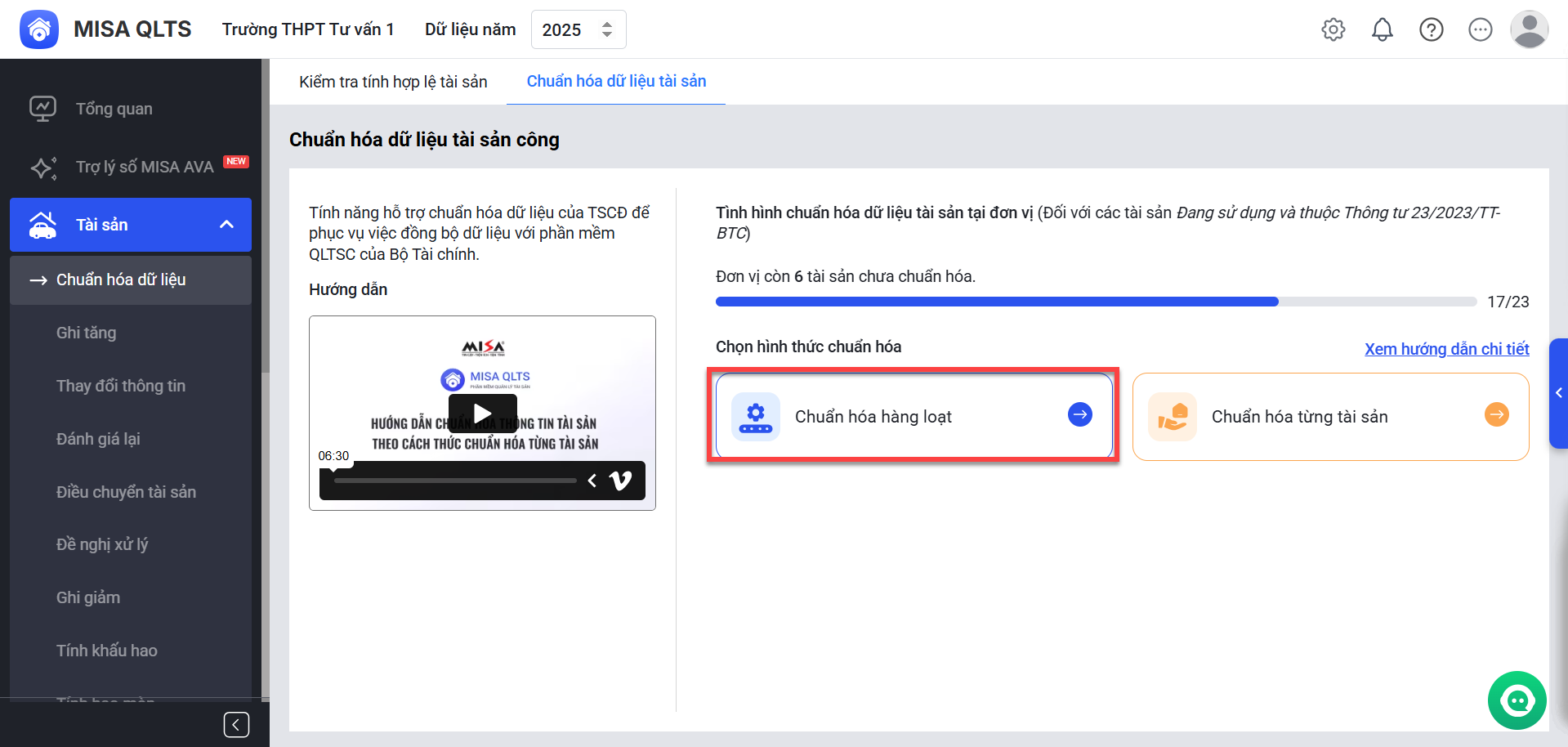 Tại giao diện Chuẩn hóa dữ liệu tài sản công anh/chị có thể theo dõi nhanh tình hình chuẩn hóa dữ liệu tài sản tại đơn vị (Tổng số tài sản; số lượng tài sản Chưa chuẩn hóa) cùng video hướng dẫn thao tác chi tiết.