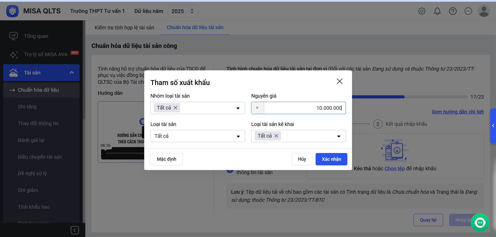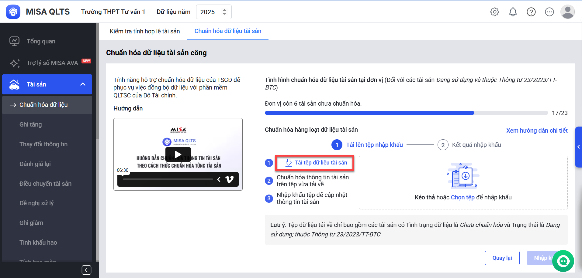 Bước 3: Nhấn Tải tệp dữ liệu tài sản / Nhấn xác nhận để tải về danh sách tài sản chưa được chuẩn hóa trên phần mềm.