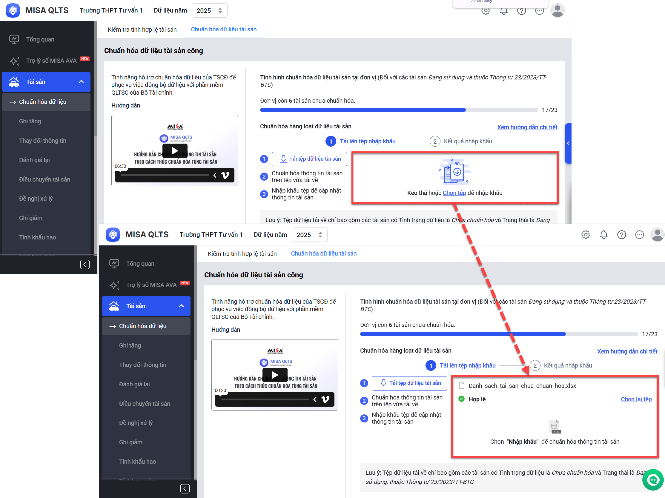 Lưu ý: Với tài sản chuẩn hóa dữ liệu thất bại, anh/chị chọn Tải tệp dữ liệu chuẩn hóa thất bại để kiểm tra, cập nhật rồi nhập khẩu lại vào phần mềm.