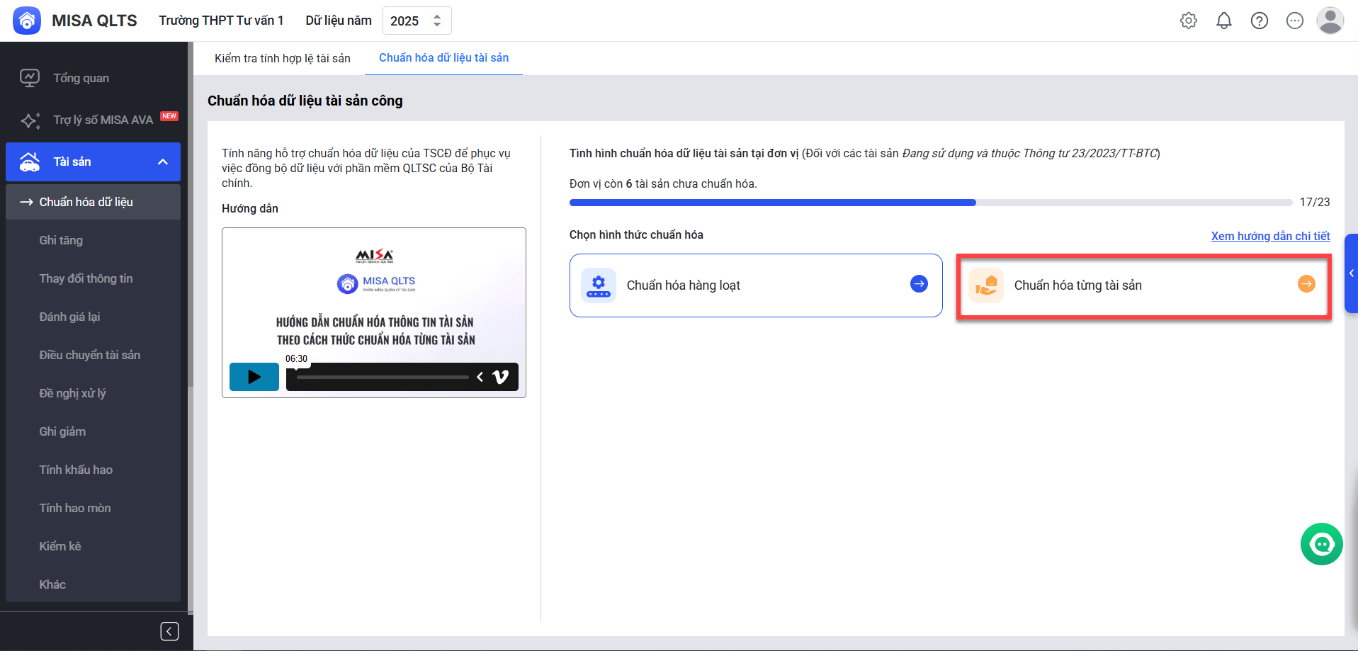 Bước 2: Chọn hình thức Chuẩn hóa từng tài sản \ Nhấn Tiếp tục.