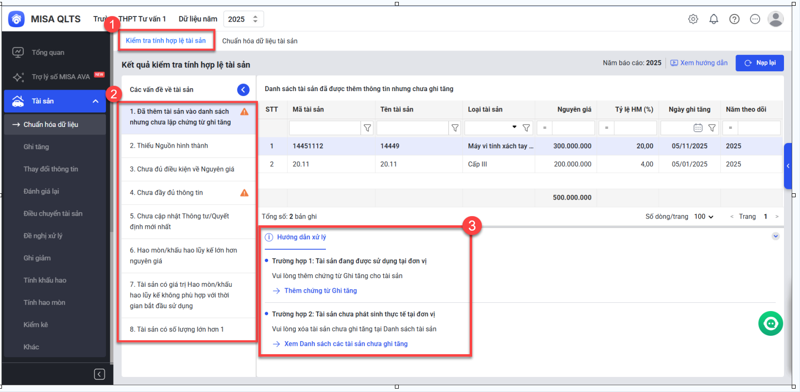 Ví dụ: Thực hiện chuẩn hóa vào năm 2025, thông tin tài sản được cập nhật lại từ ngày 01/01/2025.
