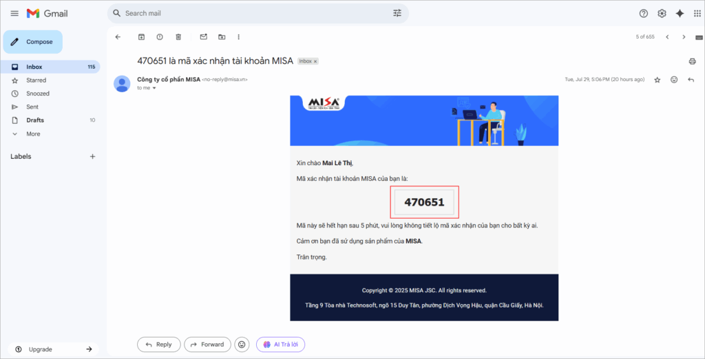 - Anh/chị mở email đã điền thông tin tài khoản để lấy mã xác thực.