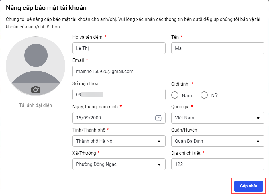 - Anh/chị hoàn thiện thông tin: Họ và tên, email (Lưu ý: nhập đúng email đang sử dụng của anh/chị để nhận mã xác thực), số điện thoại di động của anh/chị, địa chỉ (Lưu ý: chọn đúng Tỉnh/Thành phố, Xã/Phường mới sau khi sáp nhập),…