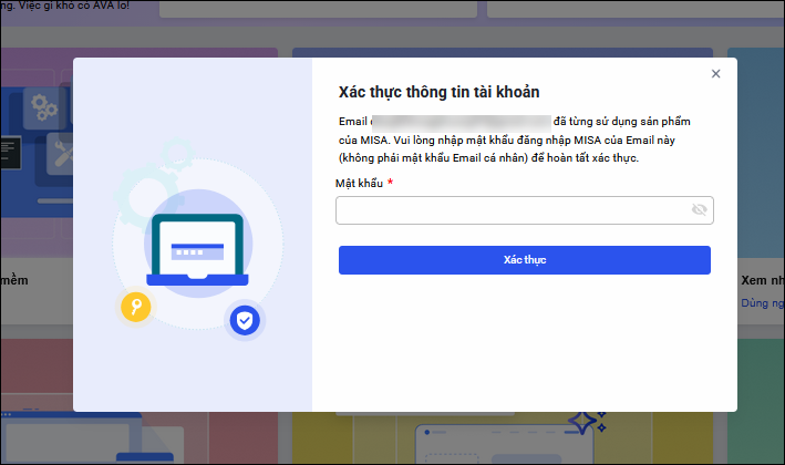 - Anh/chị nhập mật khẩu MISA ID hiện tại của email và mã xác thực được gửi qua email. Mật khẩu cần nhập là mật khẩu mà anh/chị đã từng dùng để đăng nhập các phần mềm khác của MISA, ví dụ như: Mimosa Online, EMIS, Bumas, SalaGov,… Nếu anh/chị có nhớ mật khẩu để đăng nhập phần mềm kháctrên thì anh/chị nhập mật khẩu giống mật khẩu của các phần mềm đó rồi nhấn Xác thực.