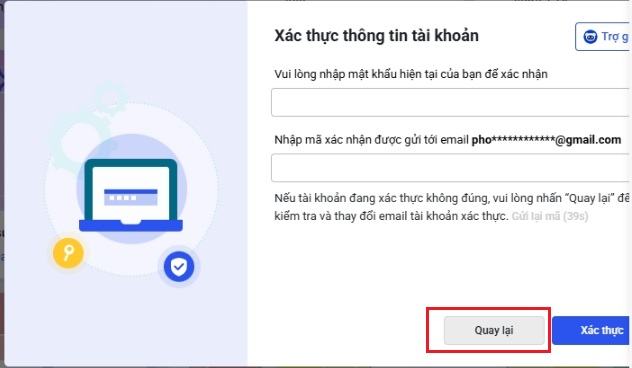 - Lưu ý về mail nhận mã xác thực: Tại bước xác thực thông tin tài khoản, để đổi email nhận mã xác thực qua email mới do email hiển thị để nhận mã xác thực là email cũ/email của kế toán trước/email không còn sử dụng, anh/chị nhấn Quay lại và nhập đúng email đang sử dụng tại bước Nâng cấp bảo mật tài khoản để nhận được mã xác thực.