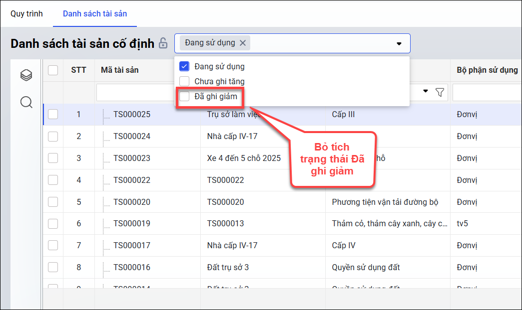 Cách xử lý: Anh/chị lọc bỏ tích trạng thái Đã ghi giảm trên danh sách tài sản để khớp 2 báo cáo.