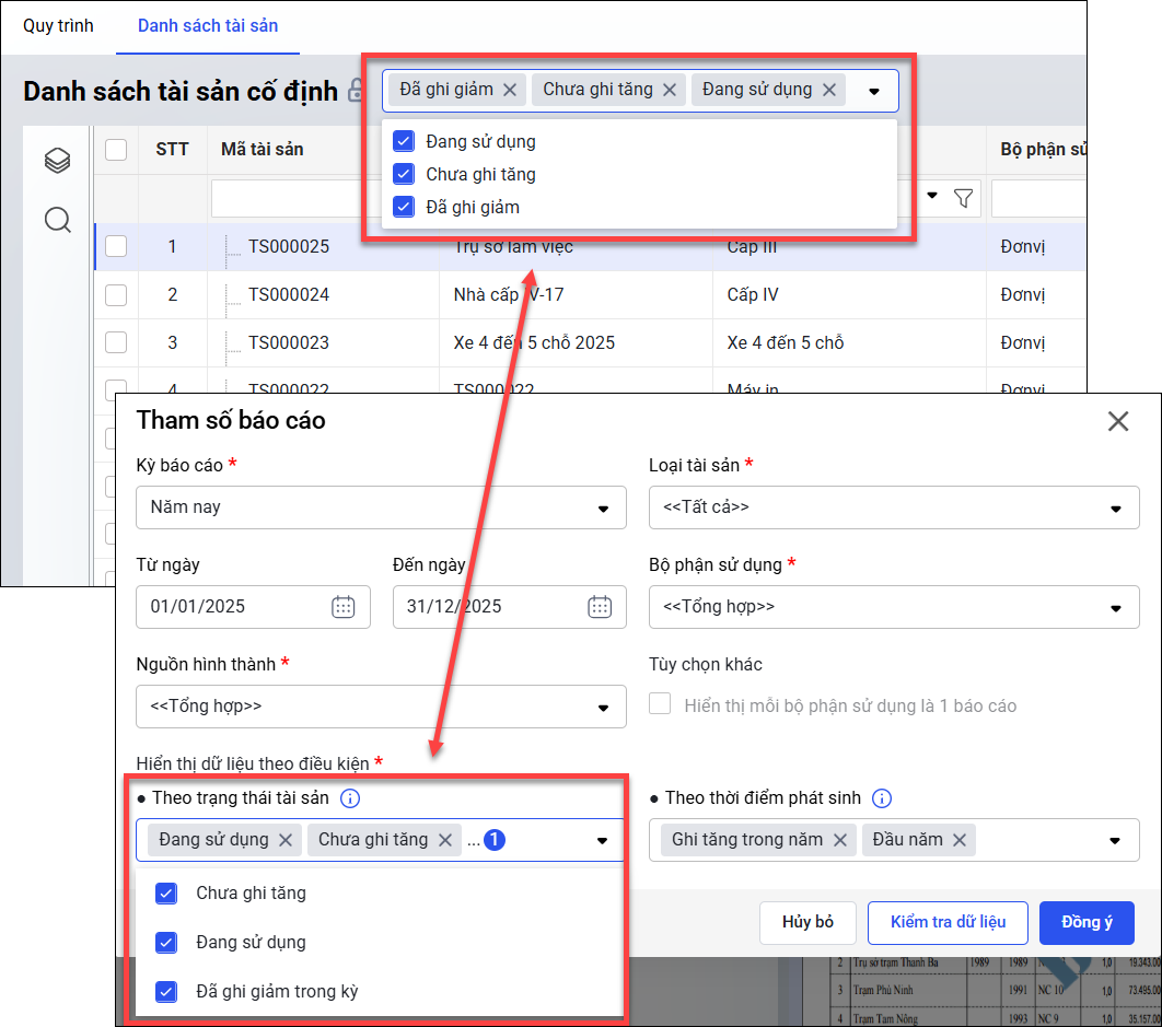 Ví dụ: Nếu trên Sổ tài sản cố định chỉ chọn tình trạng Đang sử dụng, thì trên Danh sách tài sản cũng cần lọc đúng các tài sản có trạng thái Đang sử dụng.