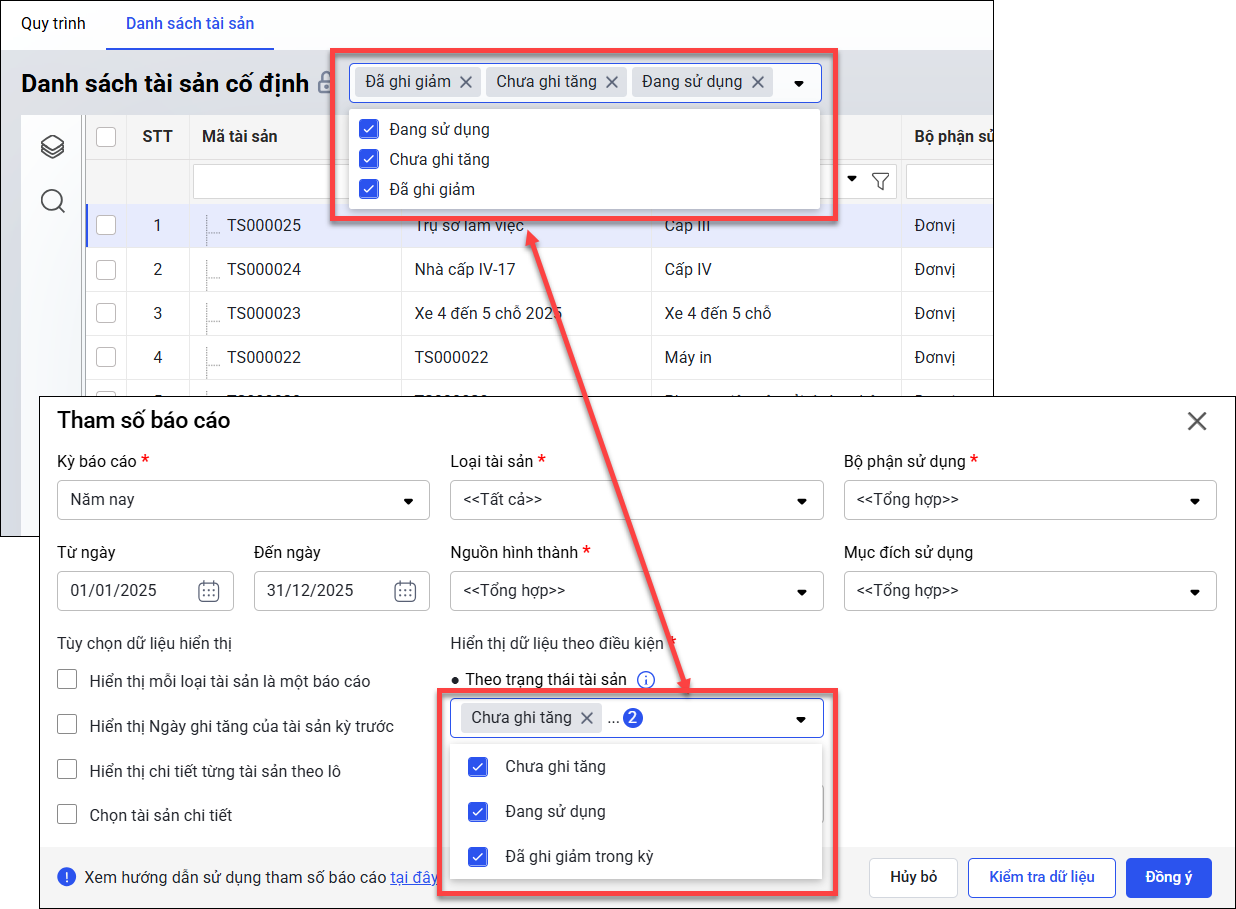 Ví dụ: Nếu trên Sổ tài sản cố định chỉ chọn tình trạng Đang sử dụng, thì trên Danh sách tài sản cũng cần lọc đúng các tài sản có trạng thái Đang sử dụng.
