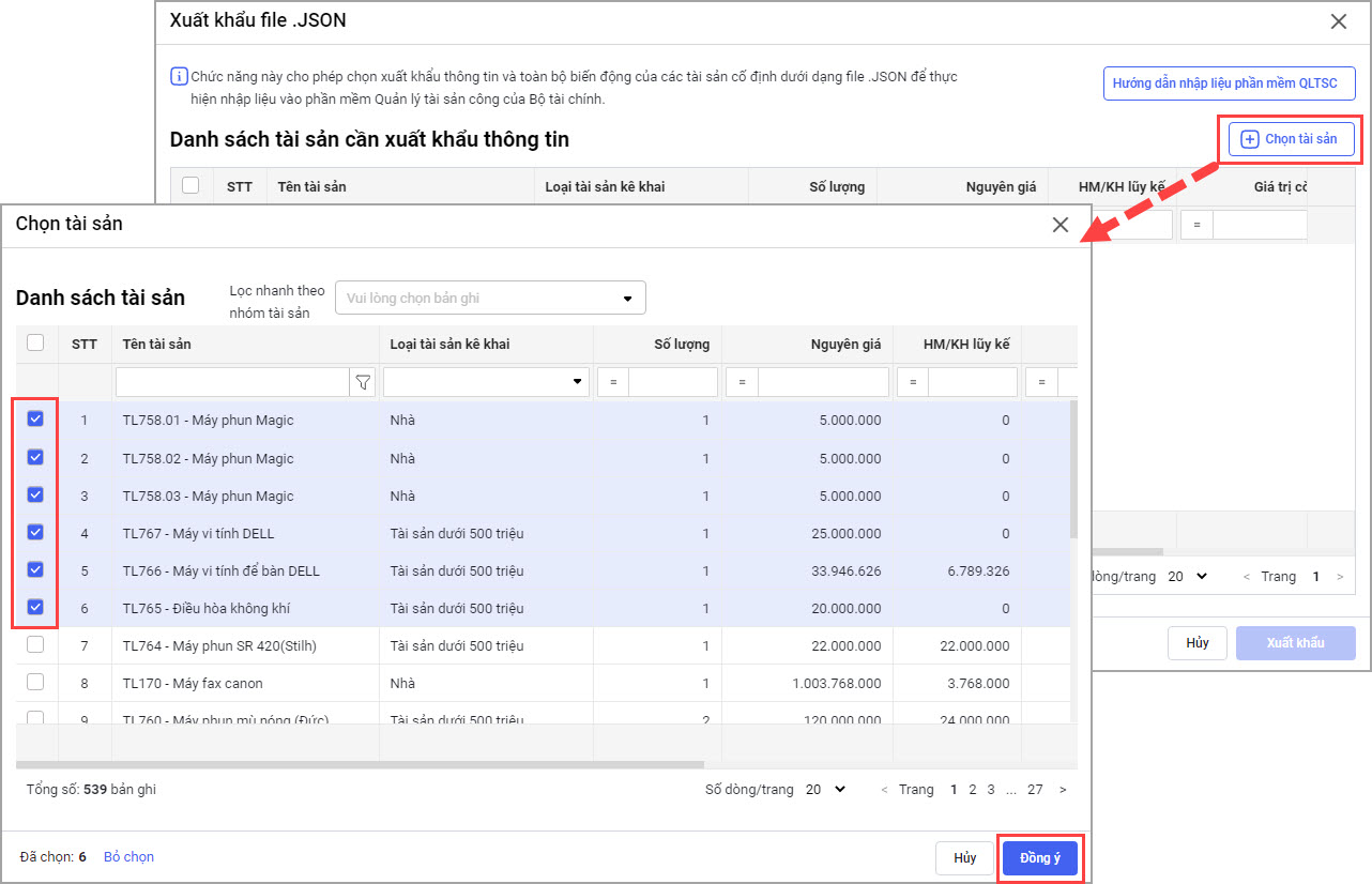 - Anh/chị thực hiện xuất khẩu file JSON và chuyển sang phần mềm QLTSC như sau: