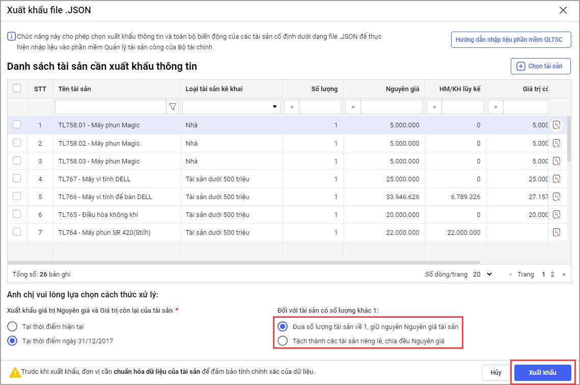 - Có thao tác Xuất khẩu dữ liệu tài sản ra file JSON.