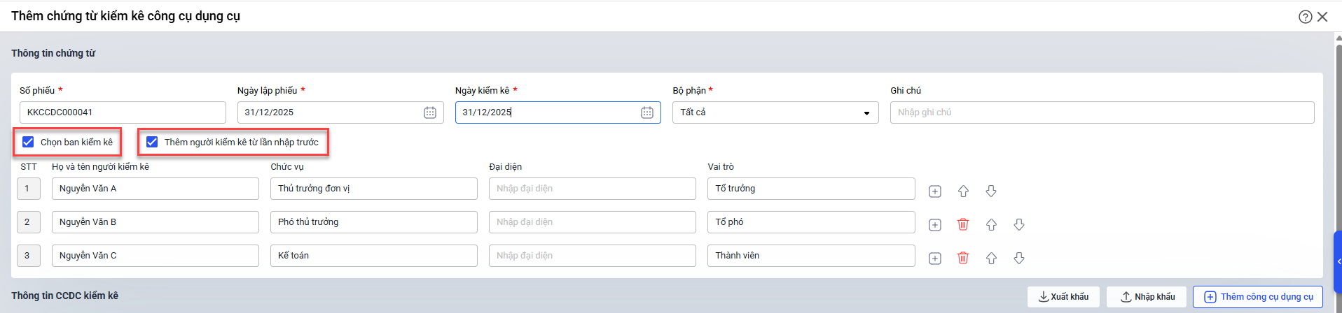 Bước 2. Nhập thông tin chứng từ kiểm kê CCDC: