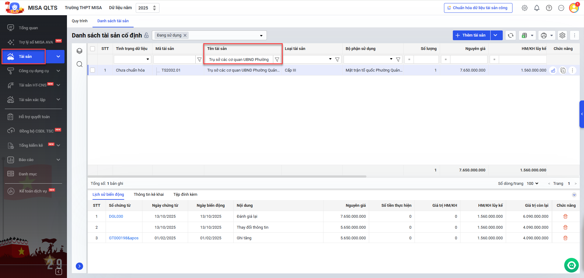 Bước 1. Tại menu Tài sản\ Danh sách tài sản\Tên tài sản, anh/chị lọc tài sản có chứng từ phát sinh cần xóa.