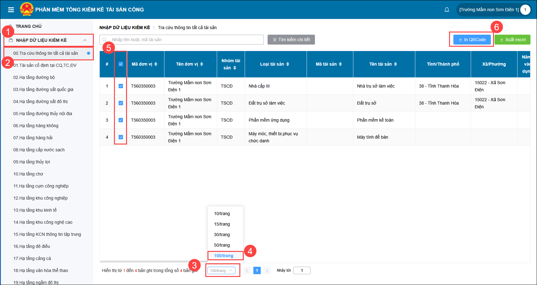 - Tại giao diện tra cứu thông tin tài sản, anh/chị có thể điều chỉnh số lượng tài sản hiển thị trên một trang (thường để là 100 tài sản/trang để thuận tiện)