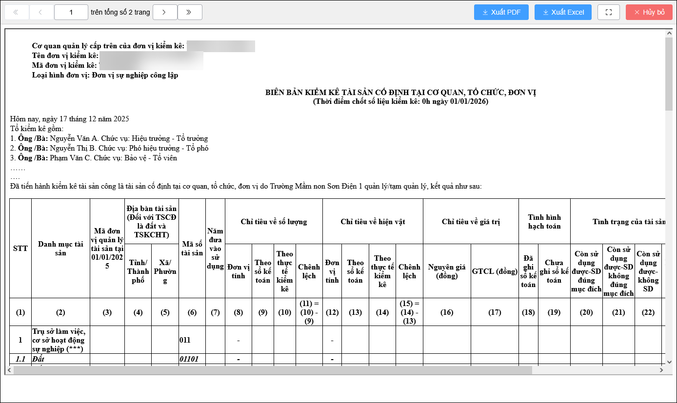 - Khi thông tin đã chính xác, thực hiện Xuất PDF hoặc Xuất Excel Biên bản kiểm kê về để in và nộp cấp trên theo quy định.