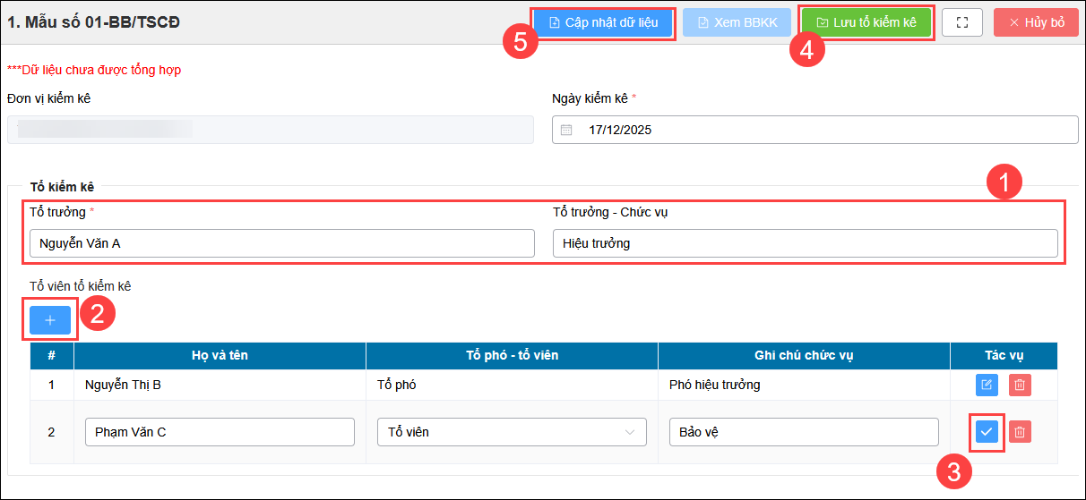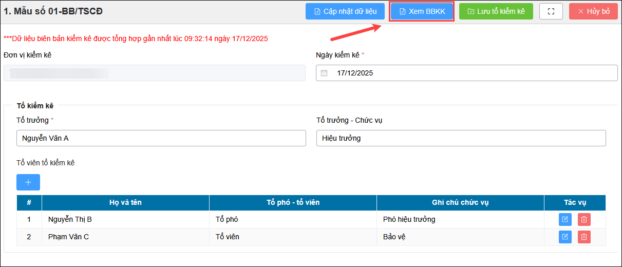 - Nhấn Cập nhật dữ liệu để tổng hợp thông tin hiện tại lên Biên bản kiểm kê.