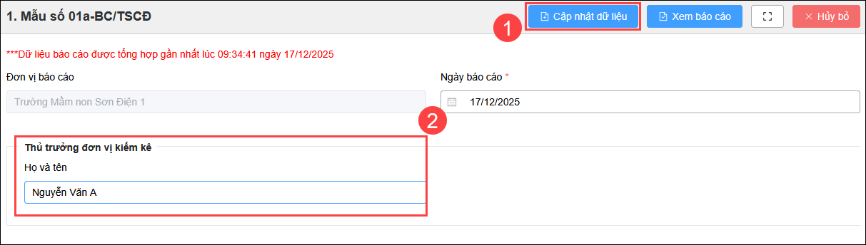 - Nhấn đúp (2 lần) vào dòng 1. Mẫu số 01a-Bc/TSCĐ. Nhấn Cập nhật dữ liệu để phần mềm cập nhật toàn bộ thông tin tài sản lên báo cáo.