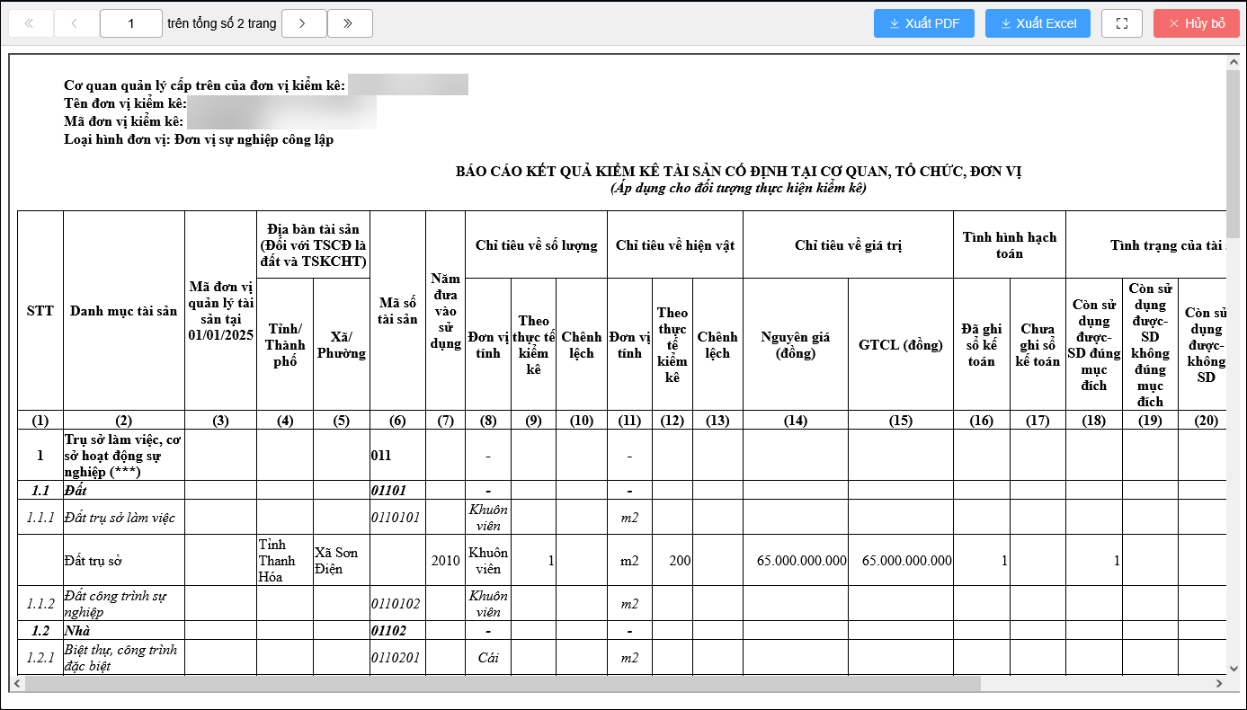 - Khi thông tin đã chính xác, thực hiện Xuất PDF hoặc Xuất Excel Báo cáo kết quả kiểm kê về để in và nộp cấp trên theo quy định.