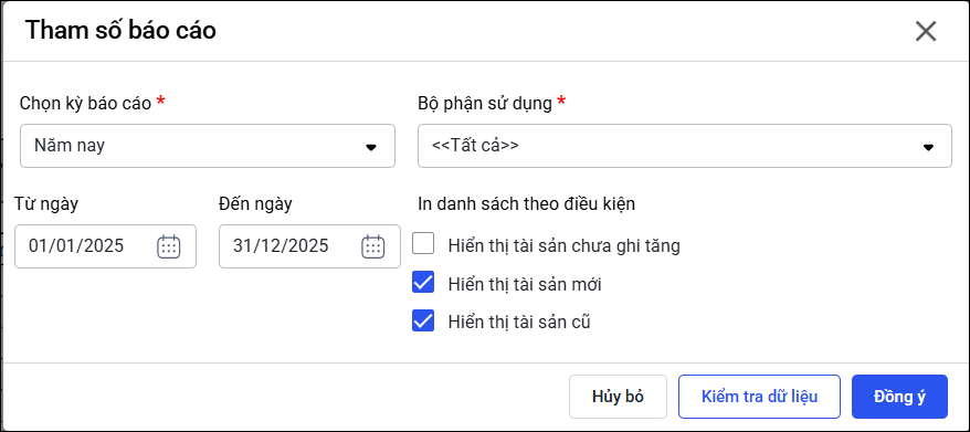 Bước 2: Phần mềm hiển thị ra tham số báo cáo, chọn năm muốn xem báo cáo và các thông tin cần quan tâm. Nhấn Đồng ý
