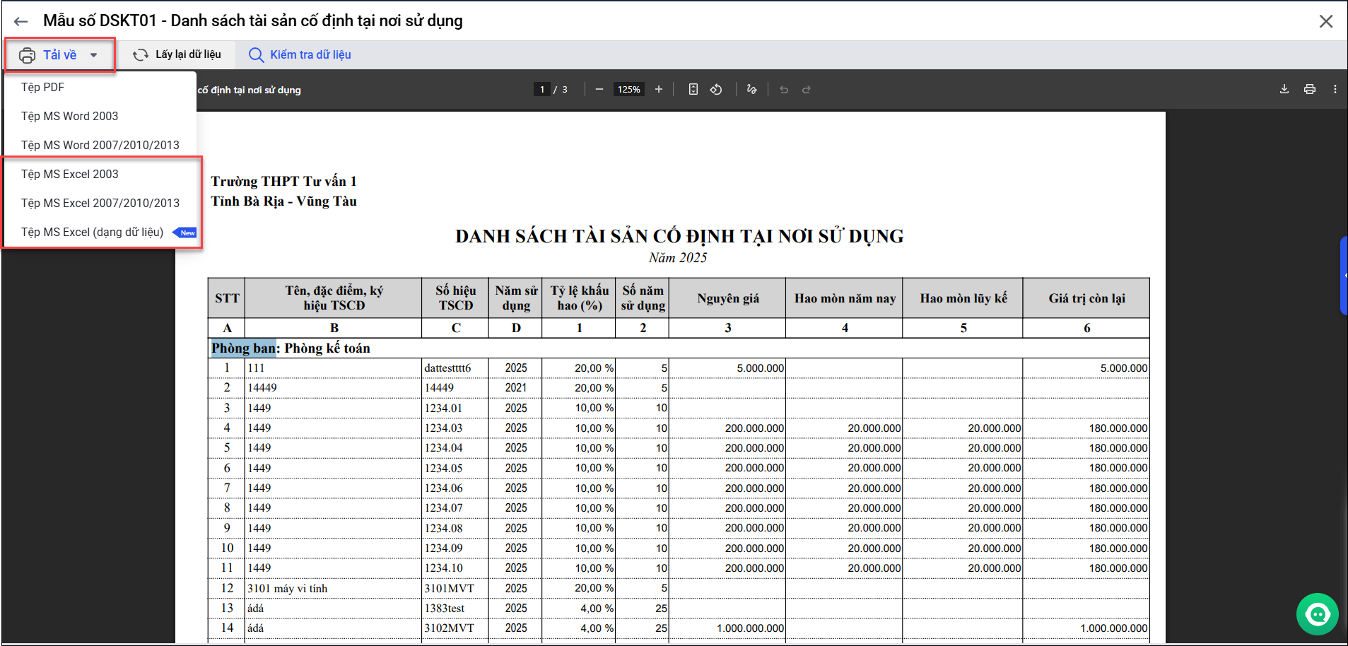 Trường hợp 1: Đơn vị muốn xuất khẩu danh sách tài sản có các thông tin “Tên TSCĐ, Mã TSCĐ, Năm sử dụng, Tỷ lệ khấu hao (%), Số năm sử dụng, Nguyên giá, Hao mòn năm nay, Hao mòn lũy kế, Giá trị còn lại, Phòng ban”
