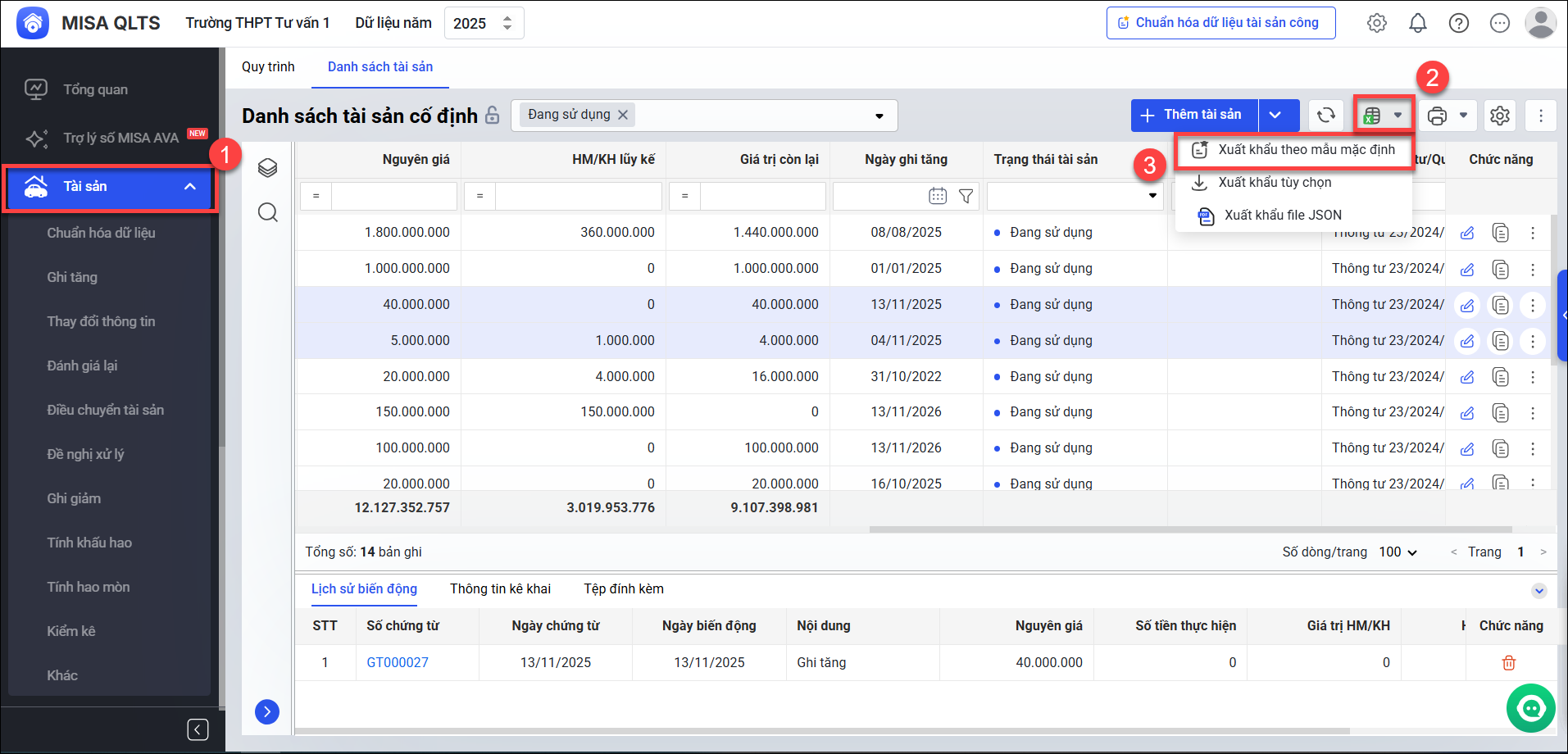 Trường hợp 2: Đơn vị muốn xuất khẩu danh sách tài sản chi tiết