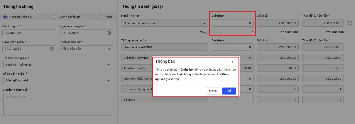 Thông báo “Tổng nguyên giá mới nhỏ hơn tổng nguyên giá cũ. Anh/chị có muốn chỉnh sửa loại chứng từ Đánh giá lại sang loại Giảm nguyên giá không?” xuất hiện là do anh/chị đang chọn hình thức Tăng nguyên giá nhưng lại nhập Giá trị mới nhỏ hơn Giá trị cũ của tài sản.