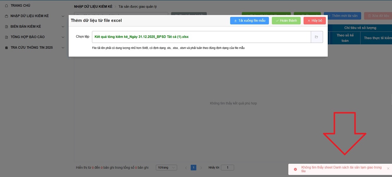 2.3. Nhập khẩu báo lỗi “Không tìm thấy sheet Danh sách tài sản tạm giao trong file”