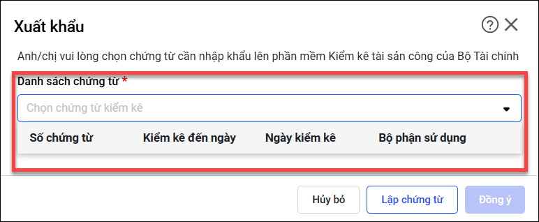 Anh/chị xuất khẩu danh sách tài sản (xuất khẩu kết quả tổng kiểm kê) trên phần mềm QLTS để nộp lên trang Tổng kiểm kê tài sản công nhưng phần mềm bắt chọn danh sách chứng từ và chị không thấy chứng từ nào để chọn hoặc anh/chị thấy nút Đồng ý khi xuất khẩu kết quả tổng kiểm kê hiện màu xám không chọn được. Bài viết này sẽ giúp anh/chị khắc phục trường hợp trên.