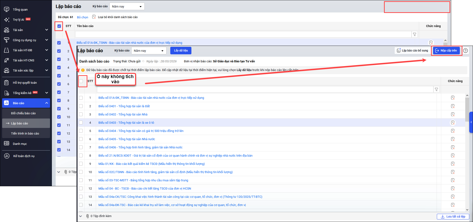 Cách xử lý: Bỏ tích tất cả các ô vuông trước danh sách báo cáo, khi không còn chọn dòng nào, nút Nộp cấp trên sẽ hiển thị lại.