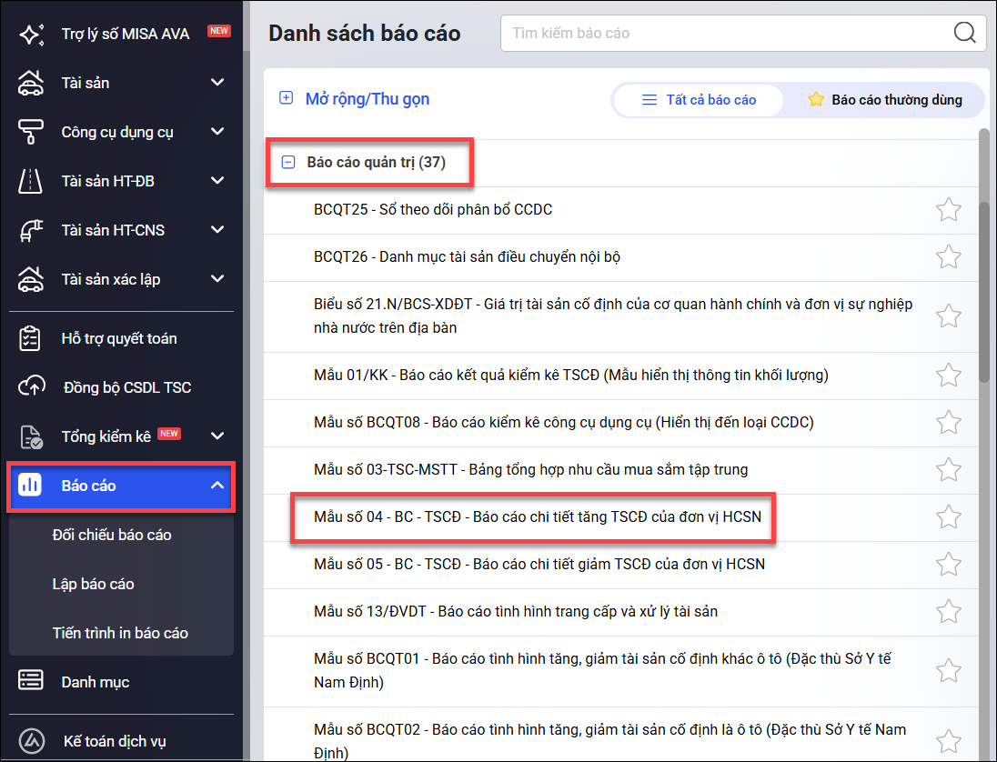 Bước 1: Vào menu Báo cáo\Báo cáo quản trị\chọn Mẫu số 04 – BC – TSCĐ – Báo cáo chi tiết tăng TSCĐ của đơn vị HCSN.