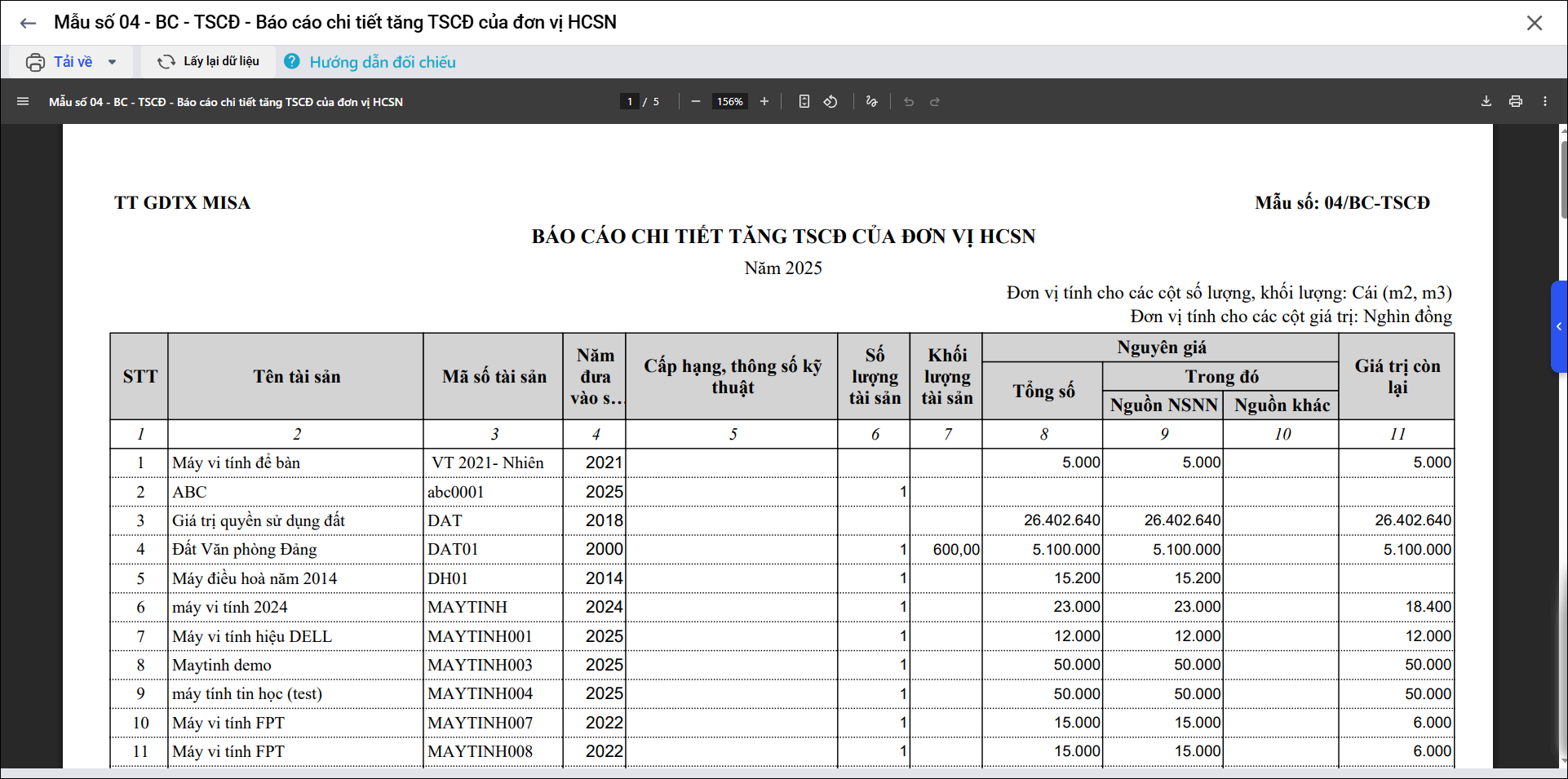 4. Mẫu số 04 – BC – TSCĐ: Báo cáo chi tiết tăng TSCĐ của đơn vị HCSN