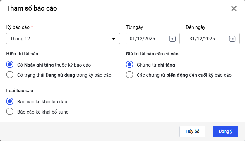 - Nếu tích chọn “Có Ngày ghi tăng thuộc kỳ báo cáo” phần mềm chỉ lấy lên các tài sản được ghi tăng trong kỳ báo cáo