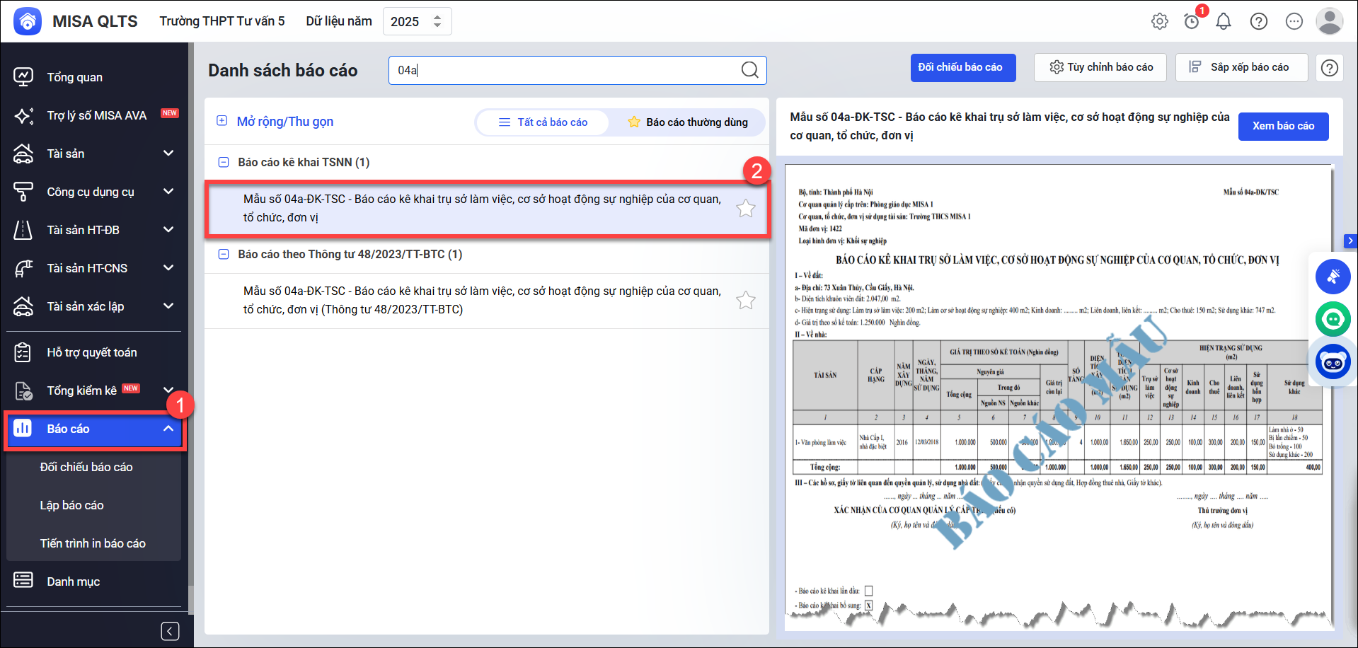 Vấn đề: Mở báo cáo (biểu/mẫu) 04a không có số liệu hoặc thấy thiếu tài sản trong báo cáo