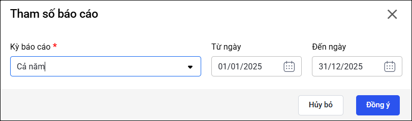 - Ô tham số Kỳ báo cáo hỗ trợ nhiều lựa chọn: chọn nhanh theo tháng, quý, năm hoặc tự xác định kỳ báo cáo bằng cách nhập “Từ ngày – Đến ngày”.
