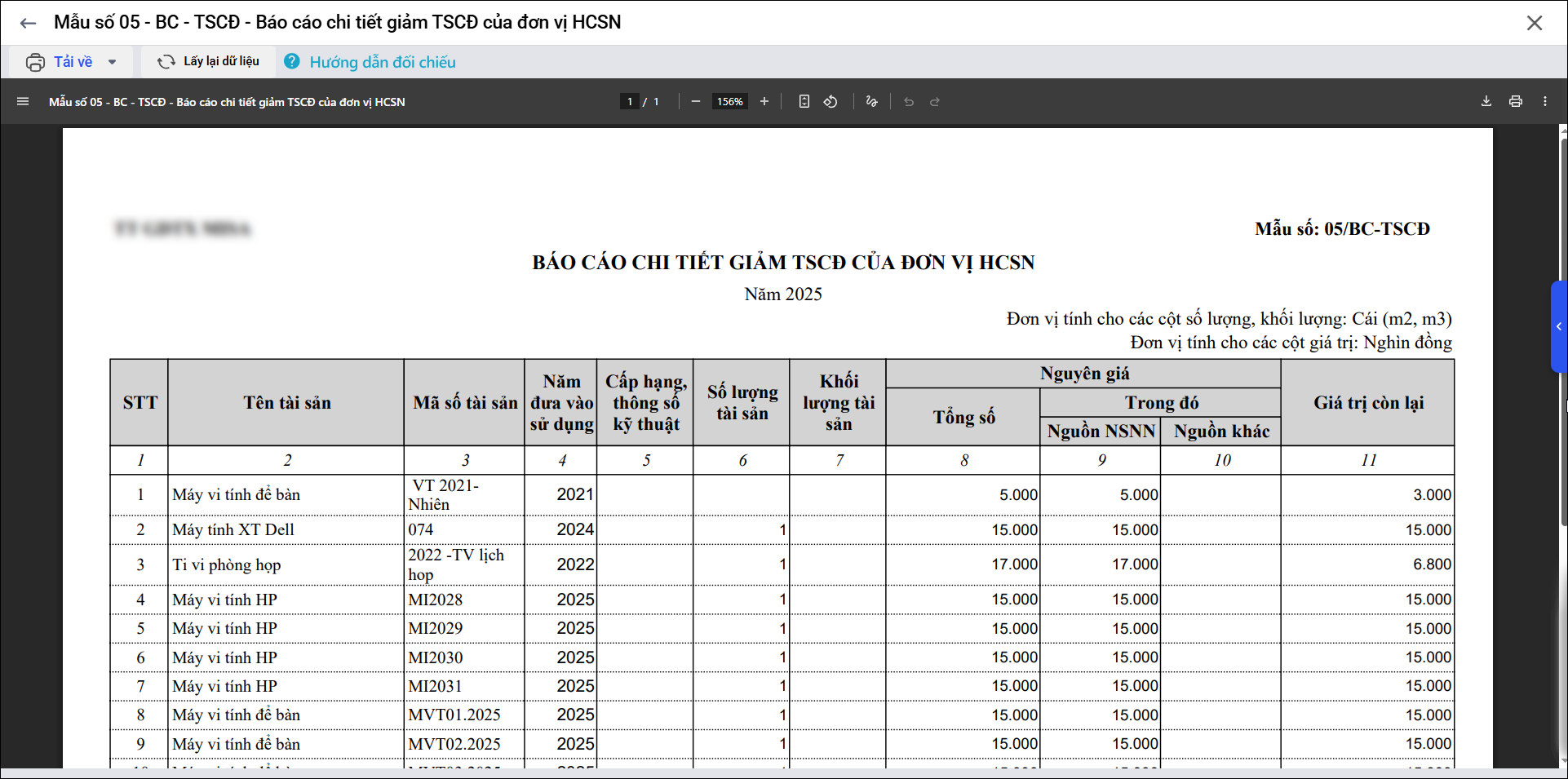 Báo cáo Mẫu số 05-BC-TSCĐ: Báo cáo chi tiết giảm TSCĐ của đơn vị HCSN có mục đích cung cấp thông tin chi tiết về mọi trường hợp tài sản cố định đã ghi giảm của đơn vị trong một kỳ báo cáo cụ thể (tháng, quý, năm).