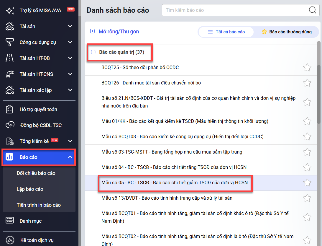 Bước 1: Vào menu Báo cáo\Báo cáo quản trị\chọn Mẫu số 05-BC-TSCĐ: Báo cáo chi tiết giảm TSCĐ của đơn vị HCSN.