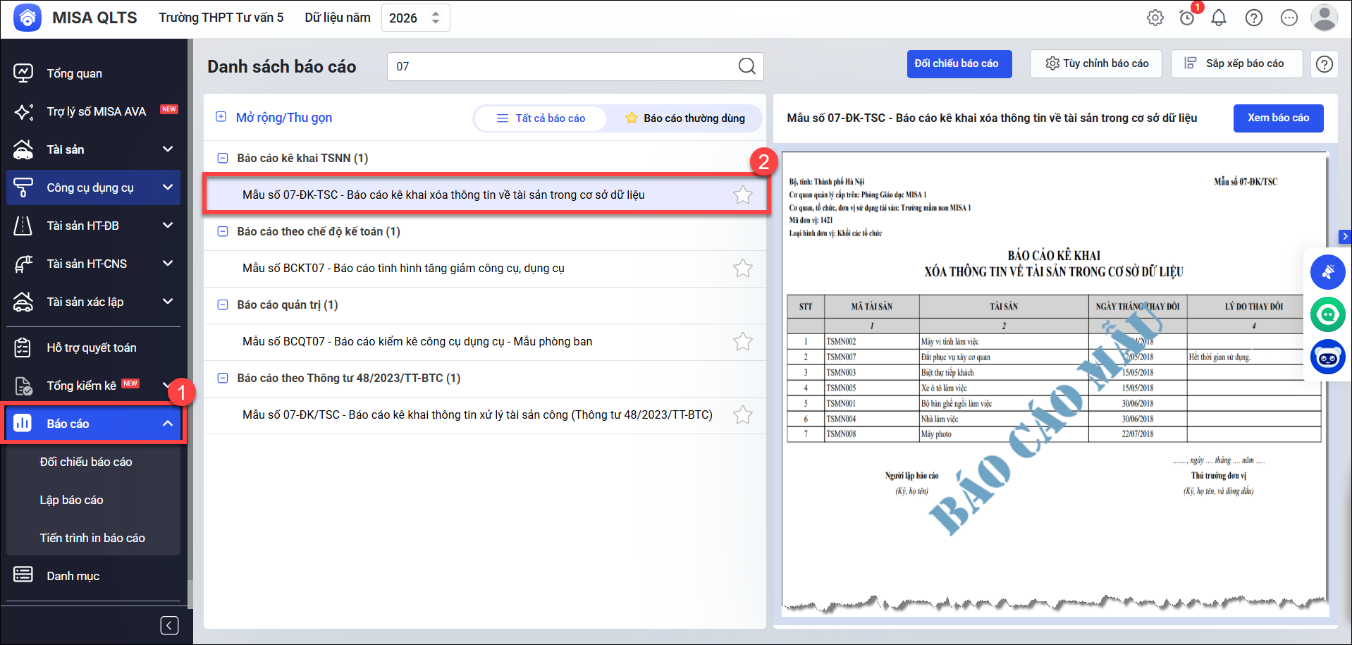 Bước 1: Vào menu Báo cáo\Báo cáo kê khai TSNN\ chọn Mẫu số 07-ĐK-TSC – Báo cáo kê khai xóa thông tin về tài sản trong cơ sở dữ liệu.