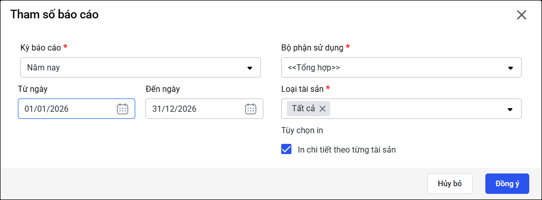 - Tùy chọn in: Phần mềm mặc định in theo loại tài sản nếu anh/chị muốn in chi tiết từng tài sản ac tích chọn in chi tiết từng tài sản.