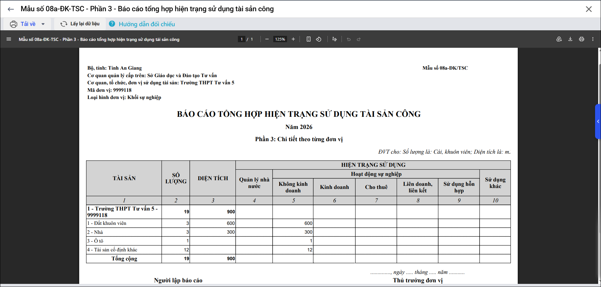 Bài viết này giúp anh/chị in được Mẫu số 08a-ĐK-TSC – Phần 3 – Báo cáo tổng hợp hiện trạng sử dụng tài sản công.